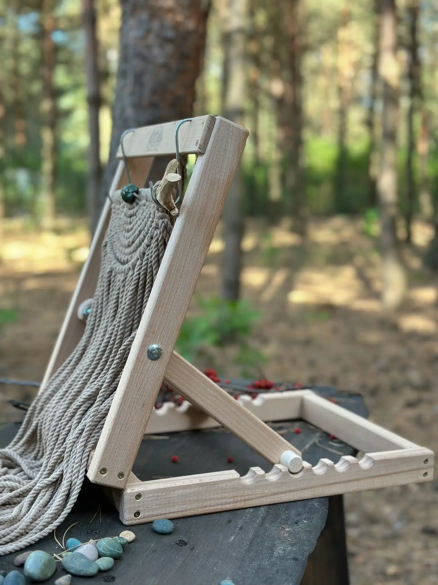 Poznaj wygodę i funkcjonalność przenośnego stojaka do plecenia makramy, zaprojektowanego z myślą o pracy na siedząco przy stole.”