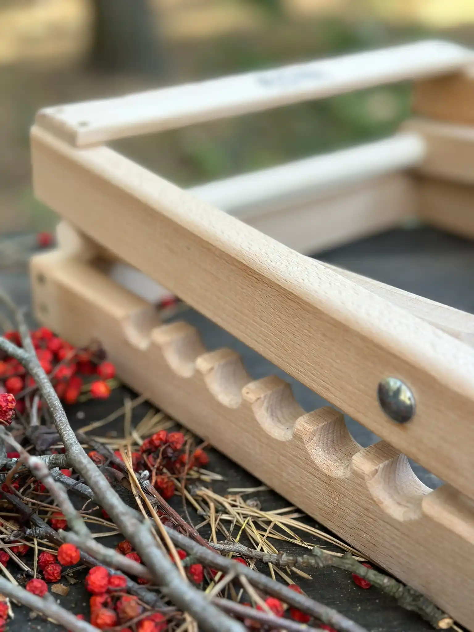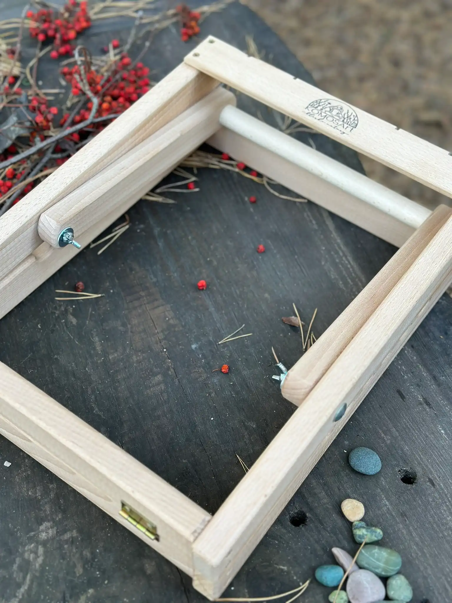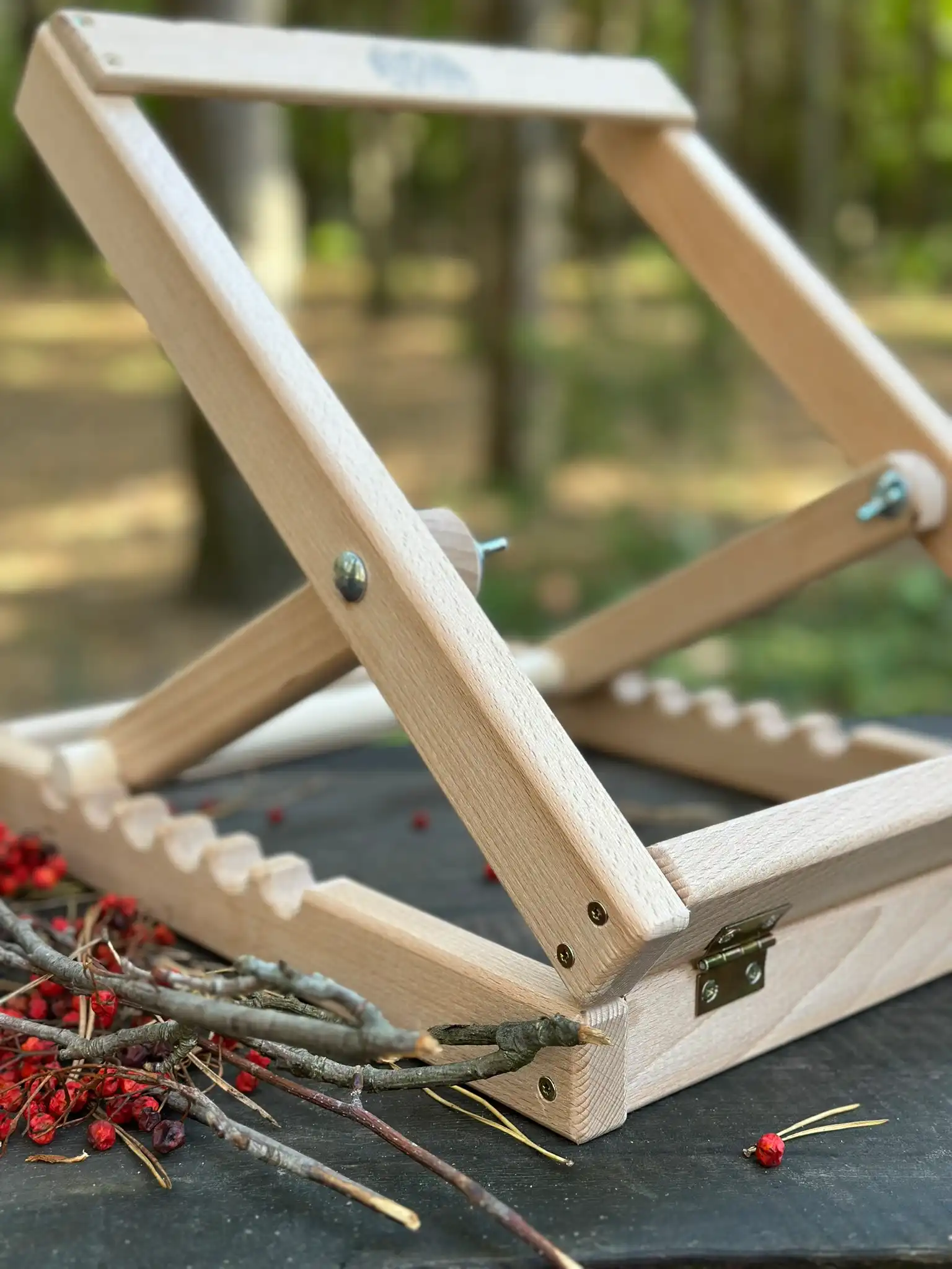 Stojak wykonany jest z drewna w naturalnym kolorze, a jego konstrukcja umożliwiająca złożenie na płasko sprawiaja, że jest łatwy w przechowywaniu i transporcie. Dzięki 4 nacięciom w górnym drążku, haczyki typu S zawsze pozostaną na swoim miejscu, zapewniając stabilność podczas plecenia.